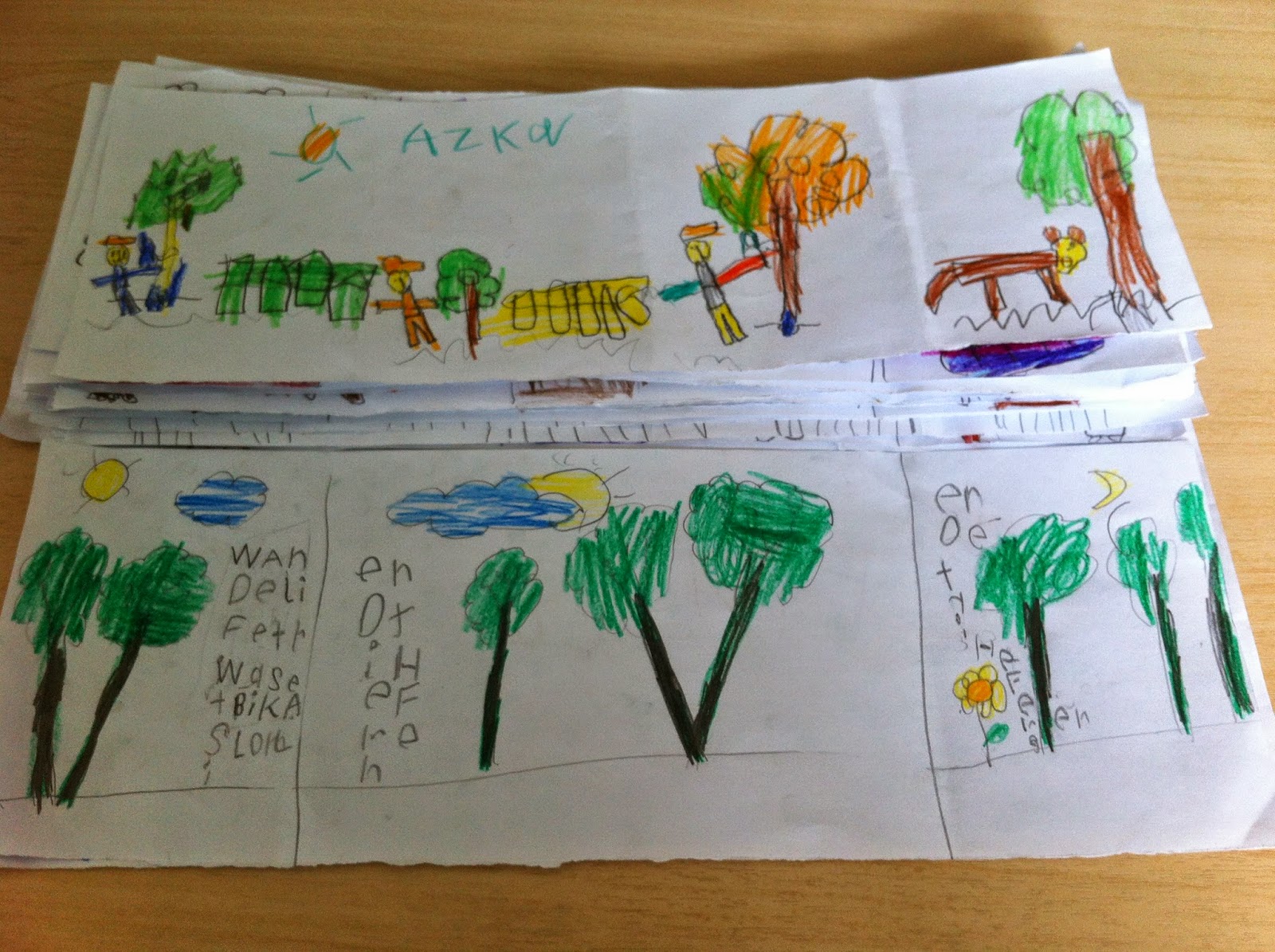 The final assignment is a group project of a puppet show. Kids split into 4 groups according to the prevalent wish for a story theme and choose their characters. They have to make their own puppets and it is entirely up to them to decide what to use: paper, natural materials, recyclables, etc.